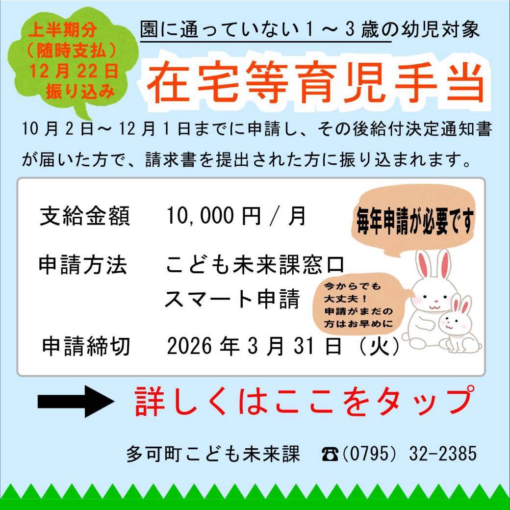 12月22日「在宅等育児手当」令和7年上半期分(随時支払)振込のお知らせ