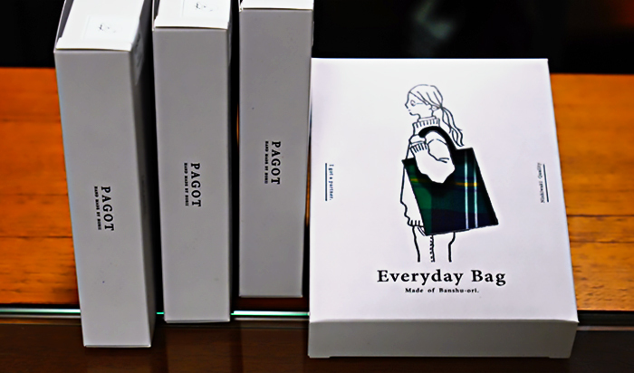 「でも、皆さんに播州織や廃棄生地を知っていただける特別な機会。パッケージにもこだわりました」と、堀井さんがエブリデイバッグの箱に手をかけると、紗由里さんが一言。