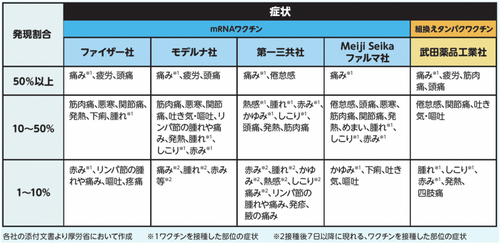 各社のワクチンについて、以下のような副反応がみられることがあります。