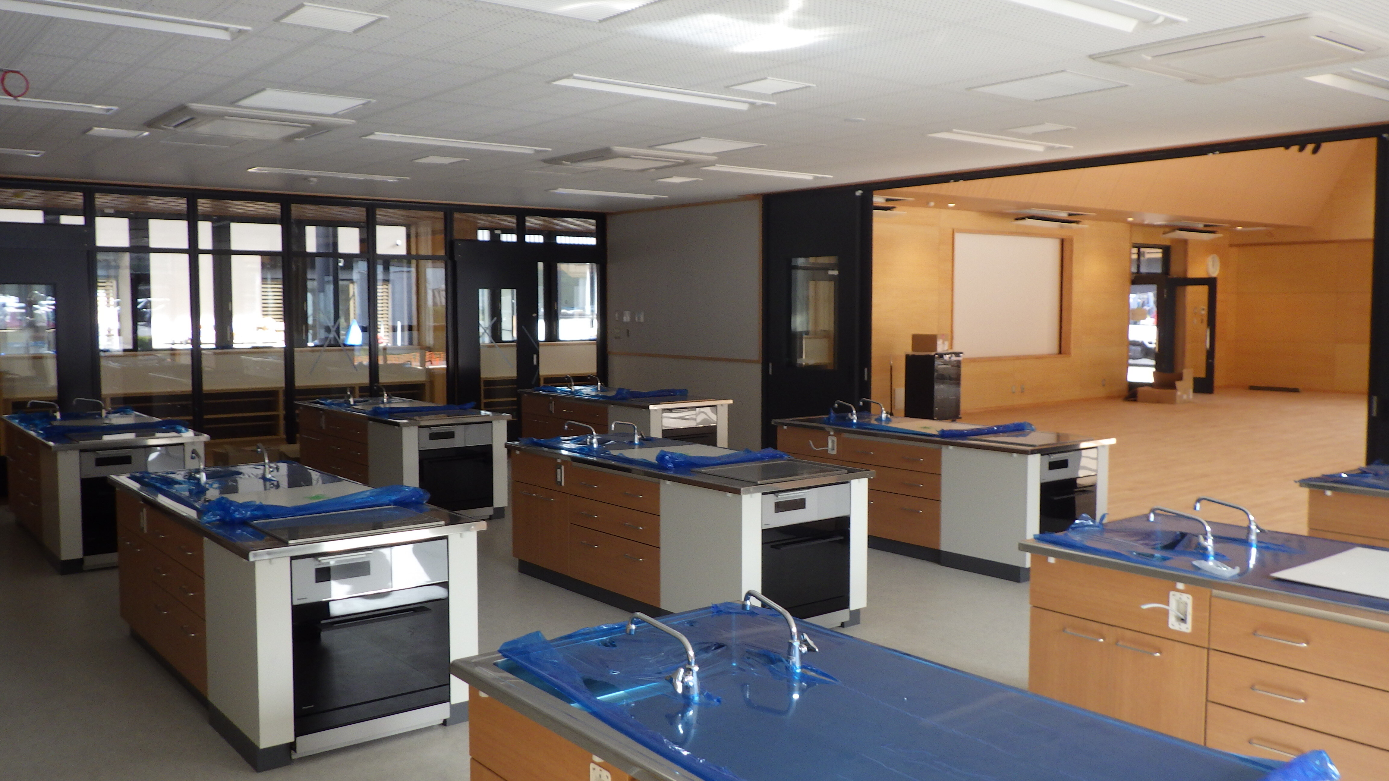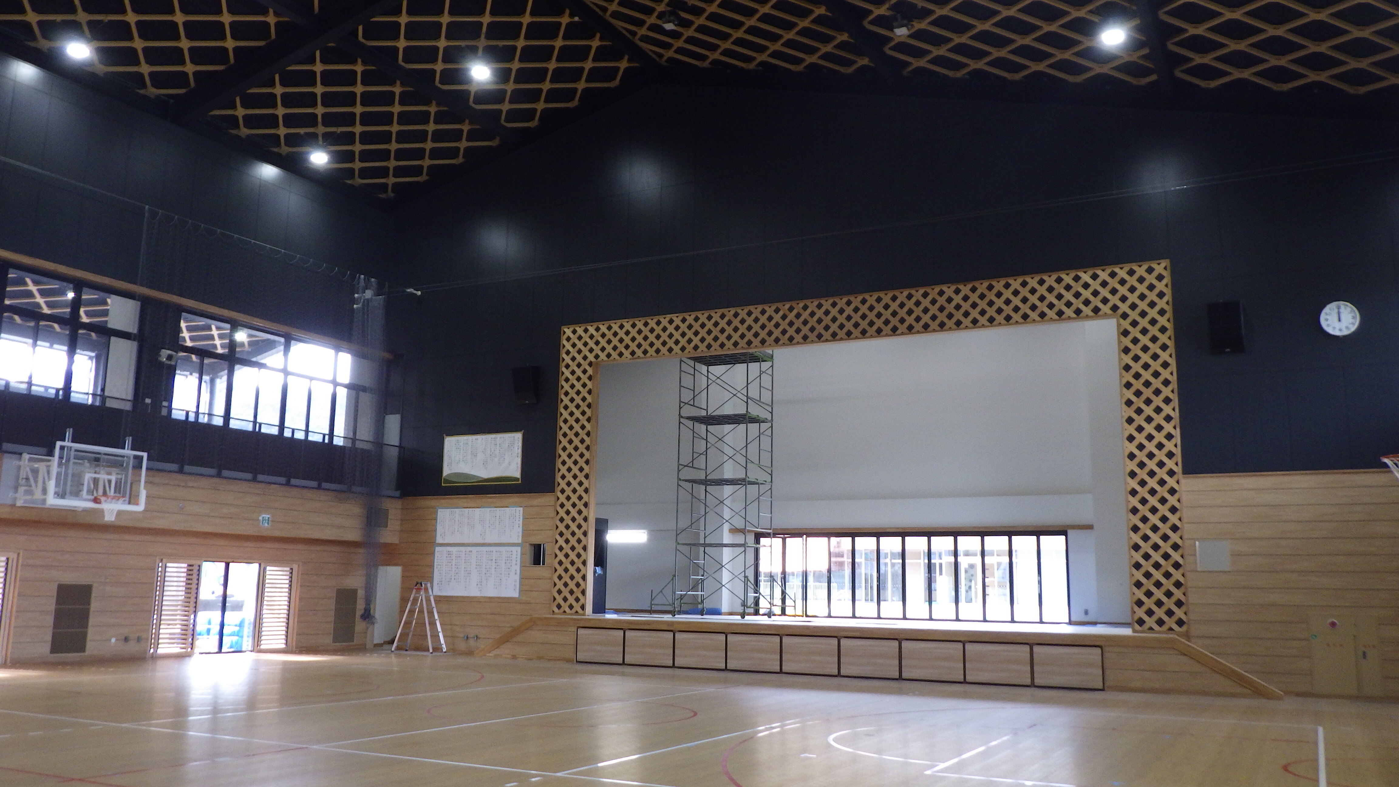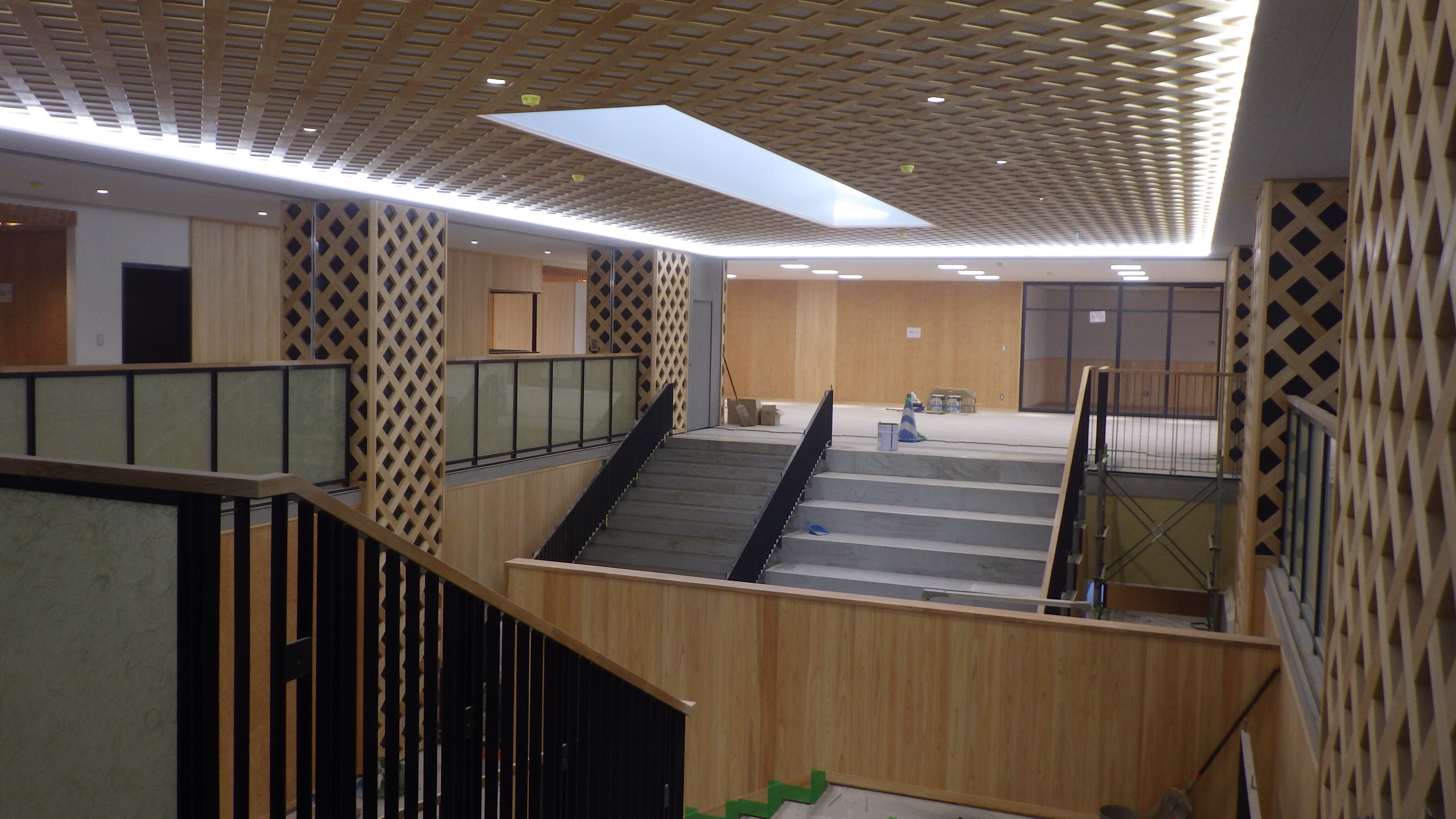 上から工程会議のようす、地域交流棟内部のようす、校舎棟大階段付近のようす、体育館内部のようす