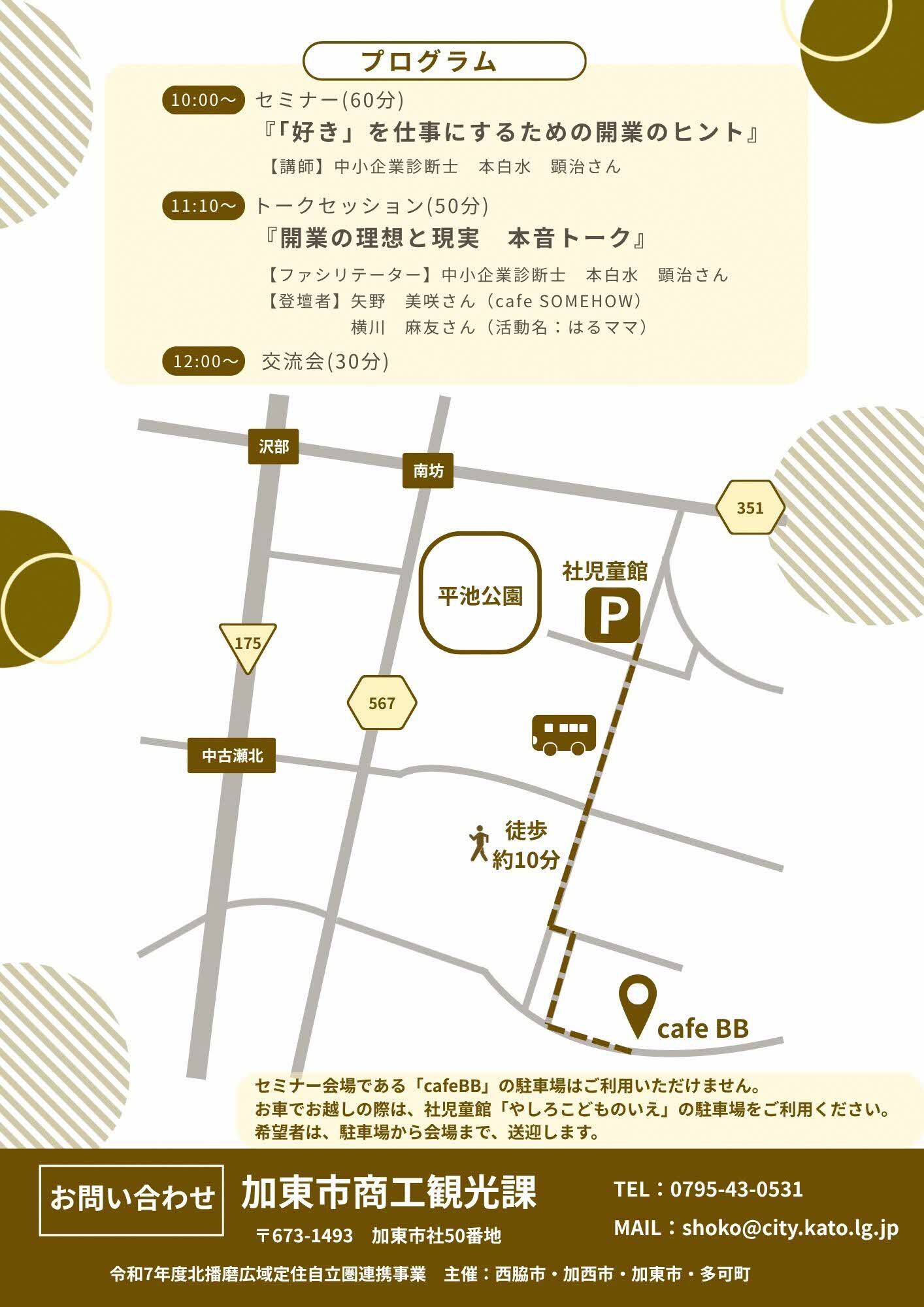 ※cafeBBの駐車場はご利用いただけません。お車でお越しの際は、社児童館「やしろこどものいえ」の駐車場をご利用ください。希望者は、駐車場から会場まで、送迎します。