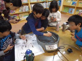 スプーンかフォークにマジックで絵を描いたり,色を塗ったり。それをトースターに入れて変形させて,取り出して好きな形にまた変形。このときは手袋か割り箸を使いました。おもしろい形ができて,みんながお気に入りの作品に仕上がりました。体験した子は14人も! 満足してもらえて,よかったー!