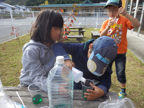参加者は10人。クズの根からデンプン採りをしました。かたいかたい根からデンプンを採り出すのですから,たいへんたいへん。みんなは協力して作業を進めました。根を掘り出したときの苦労を思い浮かべながら,頑張りました。きれいなデンプン粉にするためには,何度も水で洗って,上澄み液を捨てるという工程を経なければなりません。これを食べるのがとても楽しみ!