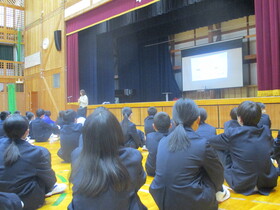 生徒会運営部から11月活動の反省がありました。また、今年も厚生部が活動についてUnicefから表彰を受けました。校長から「人権週間」と「読書」についての話がありました。
