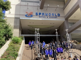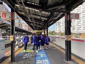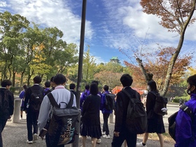 スパワールドを出発し班単位で電車で行動します。来年度の修学旅行に生かせることと思います。