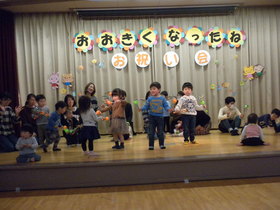 前半は、うたのお姉さんと一緒に、歌やバルーンアートを楽しみました。後半は、それぞれの年齢別にステージに上がり、手遊びや楽器遊び、ダンスなどを披露しました。みんなで互いに、大きくなった様子を感じながら、喜びあうことができた、とてもすてきな会になりました。