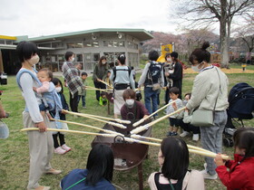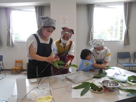 いずみ会のみなさんに、昔ながらの「ちまき」と「ひょっとで」の作り方を教えていただきました。熊笹、サルトリイバラやシュロの葉を使って、親子でこねた団子を上手に巻くことができました。蒸し上がったときには、自然の葉っぱのとてもいい香りがしました。