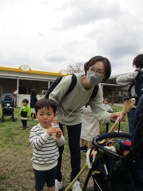 普段こども園に行っている子どもたちも参加してくれて、とても賑わいました。残念ながら、桜は散ってしまっていましたが、中央公園まで歩いて、春の草花を親子で見つけながら、季節をいっぱい感じることがきました。棒焼きパンの体験は、パンが焼けるまでの間、お母さん同士でいろいろな情報交換をして、いっぱい交流されていました。焼きたてのパンは、フワフワでとってもおいしかったですね!