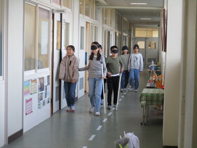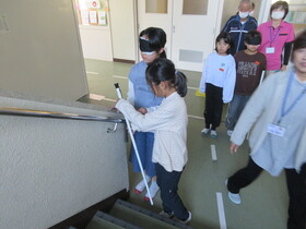 4年生が社会福祉協議会の方々と講師の先生をお招きして「アイマスク体験」を行いました。目の不自由な方の苦労や思いについて話をしていただいた後に、アイマスクを装着して廊下や階段を歩きました。体験を通して、人々が互いに支え合うことのの大切さについて学ぶことができました。