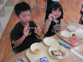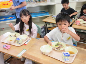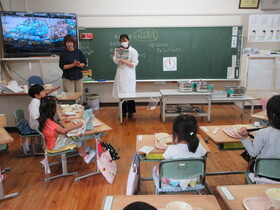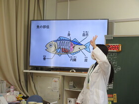 1年生が給食センターの栄養教諭の先生を招いて魚の骨の取り方を学びました。箸の使い方を教えてもらった後に、大きな画面で魚を捕る様子を紹介しました。その後、苦戦しながらも上手に魚の骨を取っていました。ご家庭でも機会があればぜひチャレンジをして上手に魚の骨を取ることができるようになってほしいと思います。