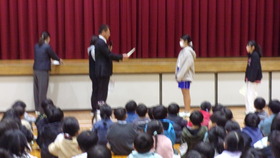 校長講話では、人間の2つの心について話がありました。また、図工や書写、あったかあいさつ賞などの表彰を行いました。