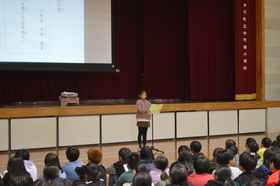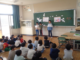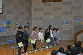 にこにこ集会(人権集会)を行いました。各クラスから選ばれた代表が、人権作文や標語、詩、ポスターの発表を行い、人権を大切にしようと呼びかけました。