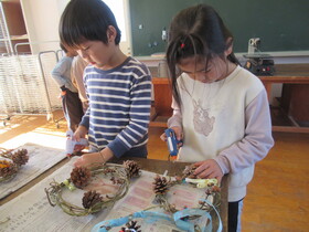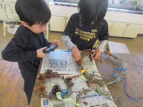 自分たちが育てたサツマイモのつるで、リースづくりをしました。グルーガンで木の実や松ぼっくりを付けてオリジナルリースの完成です。