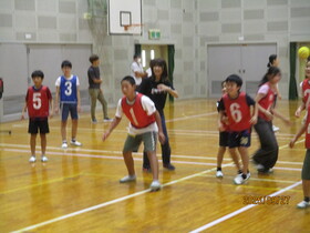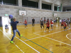 6年生が親子でドッチボールを楽しみました。6年生が投げるボールは速く逃げるのにも結構な体力を使い、いい汗を流しました。