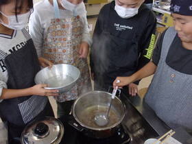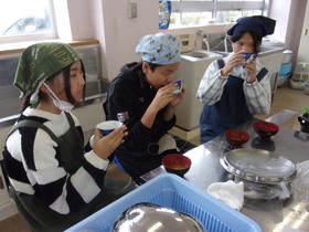 出汁の取り方の実習をしました。煮干しで出汁を取った味噌汁と、昆布と鰹で出汁を取った合わせ味噌のものと味の違いを確かめたりしました。