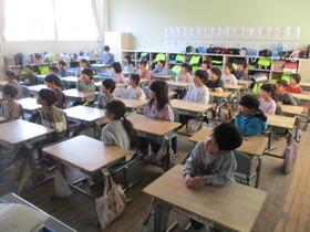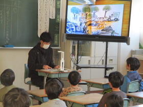 各学級に担任以外の先生が読み聞かせにやってくるほんとタイム。1年生では絵本を書画カメラでテレビに映して、読み聞かせをしました。