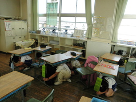 地震を想定した避難訓練と阪神淡路大震災追悼集会を行いました。今回の避難訓練は、児童がいろいろな場所にいる休み時間に行いました。