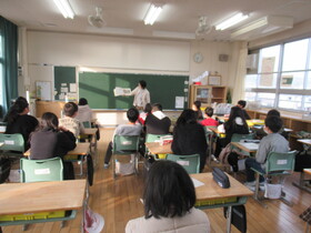 1年生が、食育の授業で魚の食べ方について学習しました。魚の模型を使って、魚の特徴や名前を覚えたり、先生から魚の骨の取り方を教えてもらったりしました。そして、班ごとに魚の身を拓く実習をしました。お箸を上手に使って、骨をとることができました。身を拓くのは難しかったですが、みんな頑張っていました。
