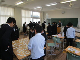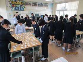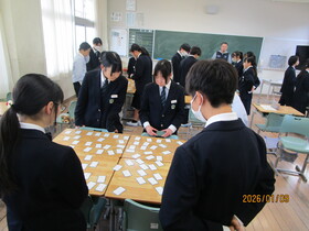 1年生の国語の授業で、クラスごとに百人一首大会を行いました。大会が始まると、机の上に並べられた札をじっと見つめながら、読み手の声に集中して耳を傾けていました。上の句が読まれた瞬間、素早く手を伸ばして札を取る姿や、あと一歩で取れずに悔しそうな表情を浮かべる様子が見られ、教室は緊張感と熱気に包まれていました。札を取るたびに自然と歓声が起こり、友達同士で喜び合ったり励まし合ったりする姿も印象的でした。来週は、いよいよ学年の百人一首大会です。この3連休、少しでも多くの歌を覚えて、大会に臨みましょう。