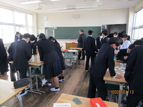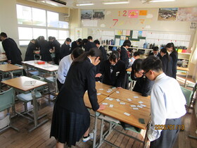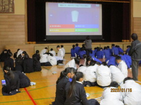 また、最後には生徒会役員による防災クイズを行いました。グループに分かれ、タブレットを使って回答する形式で実施し、防災についての理解を深めることができました。今回の訓練と集会を通して、防災への意識を高めるとともに、命の大切さについて改めて考える貴重な機会となりました。