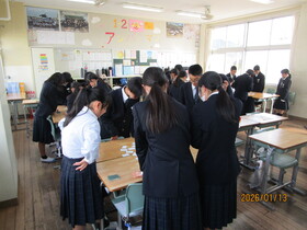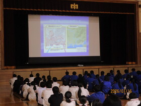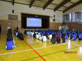 続いて行われた「1.17を忘れない」追悼集会では、犠牲になられた方々に黙とうをささげました。その後、震災・学校支援チーム(EARTH)員のT先生より、スライドを用いて「防災の必要性と自分たちにできること」と題した講話がありました。東日本大震災などの被災地での活動をふまえた内容で、生徒たちは真剣に耳を傾けていました。
