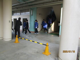 本日1校時に、防災訓練および「1.17を忘れない」追悼集会を行いました。防災訓練では、地震による建物の倒壊や火災の発生を想定し、まずシェイクアウト訓練を実施しました。その後、渡り廊下が倒壊して通行止めになったという設定のもと、状況に応じた避難経路を通って、全員が安全に避難できるよう訓練を行いました。