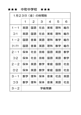 1月22日午前9時現在、多可町に大雪警報が発令されております。本日は臨時休校となります。23日(金)の時間割を掲載いたします。