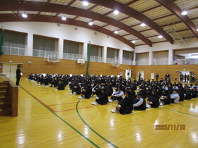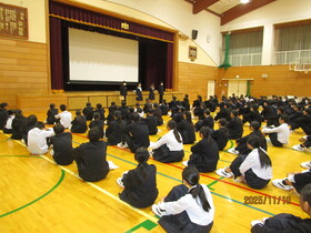 本日、朝の時間に生徒朝会を行いました。校長先生からは「文化祭をふり返って」「目的意識を大切にすること」という2つのテーマでお話がありました。また、生活指導担当のU先生からは、①自治活動の質を高めよう ②ふり返りの質を高めよう ③集団としての自覚を高めよう という3点についてお話がありました。さらに、生徒会各委員会からは、保健部によるハンカチチェックの結果報告など、4つの委員会から活動報告がありました。大きな学校行事を終えて気持ちが緩みがちな時期ですが、一人ひとりが自覚をもち、新たな目標に向かって進んでいきましょう!