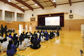 活動の最初は、加美中・中町中・八千代中の順に校歌の披露です。友だちの前で歌う緊張感もありながら、それぞれの学校の誇りを胸に、伸びやかで力強い歌声が響き渡りました。歌い終えた生徒たちの表情には達成感が浮かび、お互いの学校をたたえ合う姿がとても印象的でした。