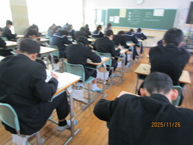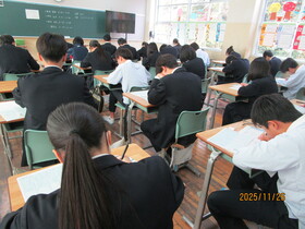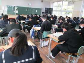 本日から 28 日(金)までの 3 日間、2学期の締めくくりとなる期末考査を実施しています。今回のテストは、2学期の学習内容がどれだけ身についているかを確認する大切な機会です。本校では2学期を通して、各教科で単元テストに取り組み、スモールステップで確実に力を積み重ねてきました。期末考査では、それらの単元を総合的に振り返りながら、学習の定着度を確認します。テストに向けて放課後や自宅で計画的に学習を進めてきた生徒が多く、休み時間にも互いに質問し合う姿が見られました。特に3年生は、進路に直結する大切な考査として、これまで以上に集中して取り組んでいます。真剣な表情で問題に向き合う姿から、これまでの努力と成長がしっかりと感じられます。