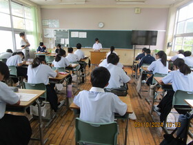 本日5校時、講師のFさんをお招きして、「トライやる・ウィーク」に向けたマナーアップ講習会を行いました。体育館には少し緊張した表情の生徒たちが静かに座り、Fさんの一言一句に耳を傾けていました。冒頭で話されたのは、「人と接するときに大切なのは、相手立場に立って思いやりをもって行動すること」 その姿勢は自然と周囲の信頼を集め、自分自身もまた丁寧に扱われる存在になっていきます。講座ではまず、「第一印象の大切さ」が取り上げられました。生徒たちは鏡に映る自分の表情を見つめながら、口角の上げ方や目線の配り方に意識を向けます。挨拶や身だしなみ、姿勢やお辞儀、イスの座り方に至るまで、実際に動きを真似しながら学ぶうちに、体育館には次第に明るい雰囲気が広がっていきました。「物の渡し方」「指し示し方」では、ペアになって練習する場面もあり、少し照れながらも真剣に取り組む姿が印象的でした。最後には、「敬語の使い方」や「電話のかけ方」も確認し、社会での振る舞いの基本をじっくり学びました。すぐに完璧にできるわけではありませんが、今日の学びを心に留め、これからの毎日の中で少しずつ実践していってほしいと思います。そして、トライやる・ウィーク本番では、自信を持ってその力を発揮してくれることを期待しています。