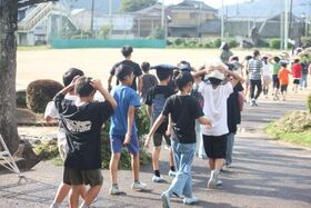 外部から講師を招いて、児童の体力アップのお手伝いをしていただいています。今回はソフトボール投げを指導していただきました。