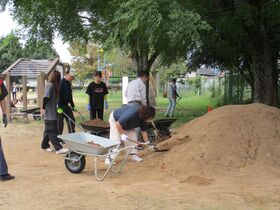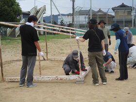 PTA奉仕作業で運動場の土入れ、草引き、校地内の草刈り、ペンキ塗り等お世話になりました。