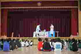 2年生が、ゲストティーチャーから播州歌舞伎の魅力について教えてもらいました。また、4年生は隈取りについて学び、実際に自分で色紙に隈取りを描く体験をしました。