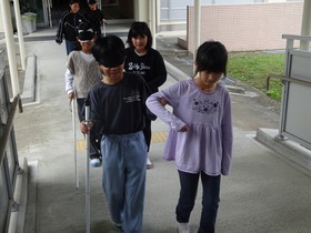 講師の方に来て頂いてお話をうかがった後、アイマスク体験を行いました。目の不自由な方の出来ることと不便に感じておられることについて理解が深まりました。