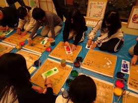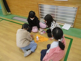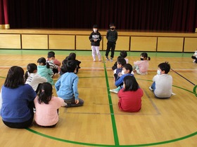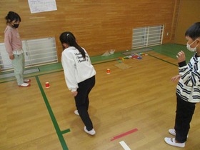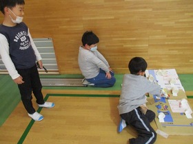 2年生がつくったおもちゃランドを1年生が体験しました。開会式の後、いろんなグループのつくったおもちゃを体験して回りました。クリアーすると手づくりの景品がもらえます。お互いにいい時間を過ごしました。