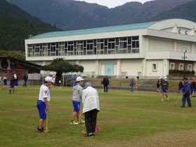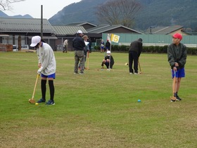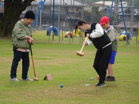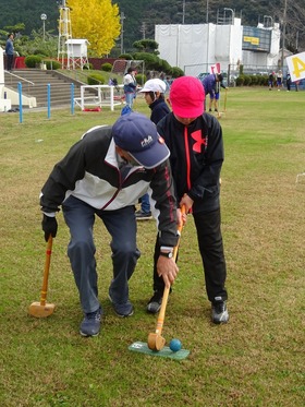 5・6年生がシニアクラブの皆さんに来ていただいてグランドゴルフをしました。チーム戦をしました。教えてもらったり、応援したりしながら、楽しくプレーしました。