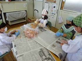 給食センターより講師の先生にきていただき、タマネギの皮むき体験をしました。目が痛くなりながら、たくさんむきました。明日の給食で使われるそうです。楽しみです。