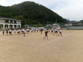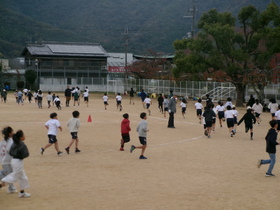 朝の駆け足運動が始まりました。体力向上の取組です。合わせて、大学の先生に来ていただき、中高学年を対象に、長い距離を走るための授業も行いました。今日のポイントは手の振り方と、短距離走との違いを意識することです。