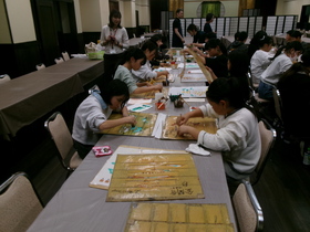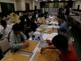 友禅染体験です。みんな黙々と作業中。素敵な記念品ができ上がり!