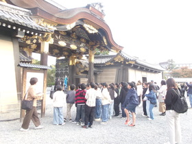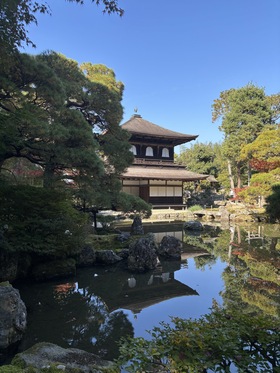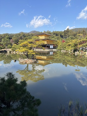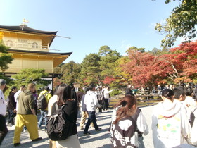朝一番は、二条城。次に、銀閣寺。さらに、金閣寺を見学。たくさんの人に揉まれながら進みます。快晴でとても美しく、水面に映えます。