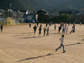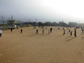 朝の駆け足運動実施中です。晴れた日でも、霧の日でも。みんな一生懸命に走っています!