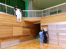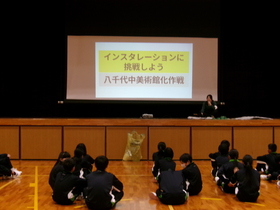 12月15日(月)の5校時に、本校1年生と北はりま特別支援学校中学部に通う友だちが、美術の授業を通した交流活動を行いました。この日に取り組んだのは「インスタレーション」といって、室内などに作品を置いて、観る人は、作品に全身を囲まれながら空間全体を体験するというものです。6つの班に分かれて、新聞紙に自分たちの型(色んなポーズの人間の形)をとって切り抜いていきます。そして、体育館全体を美術館に見立てて作品を飾り付けていきます。最初はお互いに少し恥ずかしい様子も見られましたが、活動を通して心の距離が近づいていく様子が伝わってくる温かな交流の時間となりました。