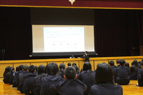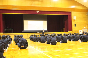 12月25日(木)に2学期終業式と生徒集会を行いました。まず、生徒集会で、生徒会本部、各専門部、各学級代表から2学期のふり返りが発表され、全校生で共有しました。その後、先日の生徒会役員選挙後に決定された新生徒会役員が紹介されました。生徒会による活動は行事等で目立つ部分もありますが、日頃の地道な活動の積み重ねがとても大事です。新しい役員にも八千代中生徒会の良き伝統を引き継いでもらいたいと思います。続いて、2学期の終業式を行いました。学校長式辞では、2学期始業式で話のあった「行事を生徒自身の手で創り上げること」「凡事徹底」についてふり返りがありました。また、冬休みにあたって①「命と安全を守ること」②「家族の一員としての役割を果たすこと」③「新しい年に向けた目標を考えること」の3点について確認がありました。その後、生活指導担当のK先生から冬休みの過ごし方についての話がありました。12日間の冬休み、家族とのふれあいなどを通じてしっかり心と身体を整え、3学期の始業式に元気な笑顔に再会できるのを楽しみにしています。