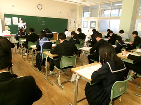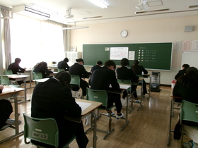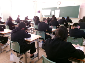 始業式の後は、3学年とも5教科のテストです。最初の教科は国語、全ての教室をのぞいてみましたが、みんなとても集中してテストに臨んでいました。特に、3年生にとっては進路に向けてとても大切なテストになります。どの学年の生徒も自分の力が十分出せるように、最後まで諦めずにがんばってほしいと思います。