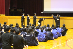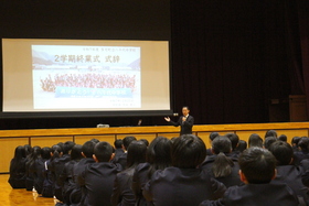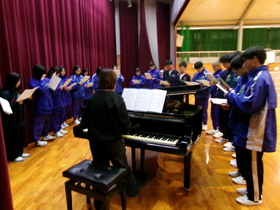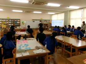 12月26日(金)に、町内3中学校の新生徒会役員が八千代中学校に一堂に会し、3中学校合同リーダー研修会を行いました。各校からは生徒会長1名と書記1名、専門部長6名の8名ずつ計24名のメンバーによる研修会です。開会式では、加美中学校長から新しい多可中学校の白色にみんなで色をつけていこうという励ましの言葉をいただきました。プログラムの1つ目は校歌練習、多可中学校の校歌は3分40秒の長さがあり初めての挑戦でしたが、50分程の時間でしっかり練習ができました。これから全校生での校歌斉唱の際にリードしてくれるのが楽しみです。また、レクリエーションや集団行動にも取り組むことで、互いのことを知ったり力を合わせたりする体験を行い、チームとしての力を高めました。午後は、生徒会担当教諭からの講義で大切にするべき視点を共有するところからスタートしました。協議1では多可中学校をどのような学校にしていきたいのかについてグループで検討し、模造紙にまとめたものを使って全体で共有しました。協議2では、それぞれの役割での「やるべきこと」「やってみたいこと」を出し合い、全体で発表し合いました。ふり返り後の感想では「ありがとう」「これからもよろしく」「今日はよかった」といった言葉が聞かれました。閉会式では、八千代中学校長から全校生が率先して動けるよう見通しをもってもらうためのリーダーの心がけなどの確認がありました。閉会の言葉の後には、一日の頑張りをお互いをねぎらう拍手が自然と起こっていました。多可中学校のリーダーとして良いスタートが切れたと思います。これからの活躍を大いに期待しています。