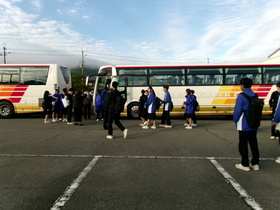 11月11日(火)いよいよ2年生の3校合同校外学習の当日を迎えました。出発式では、中町中学校のK校長先生から、大阪の街で、学び・体験・食事を通して実りのある校外学習にしようとの挨拶がありました。進行は加美中学校の委員長会です。生徒代表からは、ルールとマナーをみんなで守って想い出に残る校外学習にしようと呼びかけがありました。その後、5台のバスに班ごとに乗車して出発です。それでは、行ってきます。