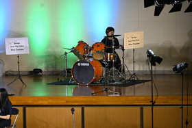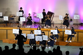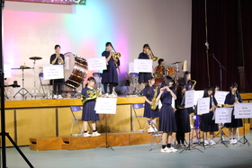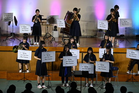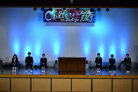 午後の部の最初は吹奏楽部による演奏です。曲目は「シュガーソングとビターステップ」「最高到達点」「となりのトトロ コレクション」「Soranji」「Family Song」「美女と野獣メドレー」の6曲です。それぞれの曲について部員からの解説があり、とてもわかりやすかったです。また、全校生の聴く態度も真剣なところと乗るところの切り替えができていていました。6曲を終えた後、アンコールがわき起こり「学園天国」を演奏してくれました。誰にとっても耳になじみのある曲でテンポもよく、大きな拍手やかけ声で大変盛り上がりました。3年生部員にとって最後の舞台となる文化祭、各ソロパートも随所に入れられ見応え聴き応え十分の演奏を創り上げてくれました。