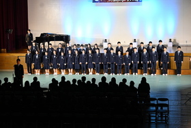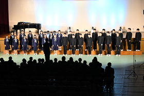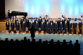 午前の第2部は合唱発表会で、学年合唱と全校合唱を披露します。まずは1年生の「大切なもの」です。初めての混声合唱でしたが、明るく元気な声で「がんばれ」「負けないで」「一人じゃない」といったメッセージをしっかり届けてくれました。2年生は「時の旅人」です。歌に込められた「時間を越えて生きる人間のつながり」と「今を大切に生きる心」というメッセージを、少し大人になった声で力強く歌い上げてくれました。3年生は「春に」に挑戦しました。来年春に進路を控えている3年生にとって心に響く曲です。思春期の心の揺れや不安の中でも前向きに生きていく決意を、男声と女声の素晴らしいバランスで表現してくれました。そして、全校合唱。ここは我々教員も参加させていただきました。曲目は「いのちの歌」です。「命の循環」や「人とのつながり」を「今生かされていることへの感謝」の思いを込めて優しく歌いました。各パートが響き合うハーモニーを味わいながら、全校生が一つの合唱を創り上げる瞬間は感動的でした。そして、八千代中学校としての最後の文化祭を記念して「みんなで歌おう」のプログラムで「翼をください」を生徒と教職員に加えて会場の皆さまにも一緒に入っていただいて合唱しました。みんなが元気になる楽しい時間となりました。