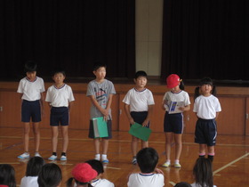 今日は児童朝会がありました。児童朝会では各学年の代表児童が「がんばり宣言」をしました。「がんばり宣言」では、どの学年の児童も最後の運動会を成功させたいと宣言していました。気合い十分です。今日の運動会の練習でも気迫が伝わってきました。また、今週から始まる「あいさついっぱい大作戦パート2」の説明がありました。地区毎に挨拶当番の立番をします。気持ちのよい挨拶がどんどん広がるといいですね。